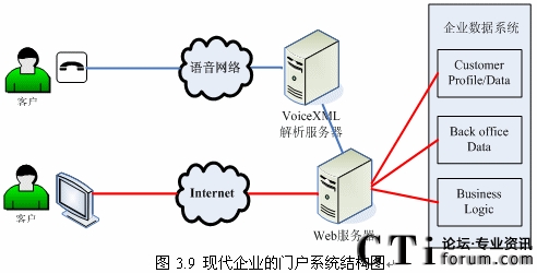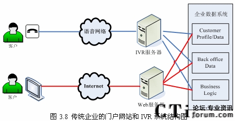隨著Internet和Web技術(shù)的迅速發(fā)展,越來(lái)的企業(yè)開(kāi)始建立自己的門戶網(wǎng)站,同時(shí)又擁有自己的IVR系統(tǒng)(如圖3.8所示),但是兩套系統(tǒng)完全獨(dú)立,語(yǔ)音系統(tǒng)和數(shù)據(jù)系統(tǒng)沒(méi)有任何交互或者只有很少的交互。而建立IVR系統(tǒng)的目標(biāo)就是給客戶更好的體驗(yàn),使客戶能方便的通過(guò)電話完成更多以前需要登陸企業(yè)門戶網(wǎng)站,或者親自去企業(yè)或其網(wǎng)點(diǎn)去辦理的業(yè)務(wù),這就需要IVR系統(tǒng)能跟后臺(tái)數(shù)據(jù)系統(tǒng)有更多更好的交互。“語(yǔ)音門戶”的概念出現(xiàn)也愈發(fā)的證明這一點(diǎn)。