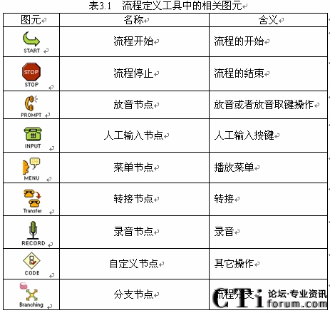 IVR系統(tǒng)的過(guò)程定義工具是一個(gè)可視化的軟件工具,它主要用于定義工作流模型中各個(gè)活動(dòng)之間的關(guān)系[22]。工作流程過(guò)程定義向用戶提供對(duì)實(shí)際業(yè)務(wù)處理過(guò)程分析、建模的手段。其輸入輸出可以用圖3.2表達(dá):