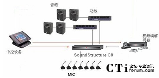 根據(jù)用戶的需求,結(jié)合用戶會議室現(xiàn)有的設(shè)備,我們選用寶利通具有獨特聲音處理技術(shù)的音頻處理平臺——SoundStructureC8。SoundStructureC8連接本地麥克風和功放系統(tǒng),通過反饋聲抑制的功能來消除本地擴聲導(dǎo)致的嘯叫,保證會議室的聲音效果。C8聲音處理系統(tǒng)還可以和視頻會議以及電話會議一起使用,解決遠程會議的回聲和噪聲問題,改善會議質(zhì)量,提高會議效率。