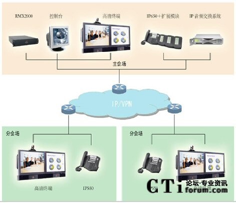 每個(gè)會(huì)場分配一個(gè)專用的IP地址,終端設(shè)置一部Polycom IP550電話, 在中心會(huì)場的指揮電話及擴(kuò)展模塊上設(shè)置每個(gè)分會(huì)場快速呼叫功能鍵,中心會(huì)場的管理人員只需按下IP650及擴(kuò)展模塊上的對應(yīng)于各分會(huì)場的快捷按鍵,即可迅速接通各個(gè)分會(huì)場。