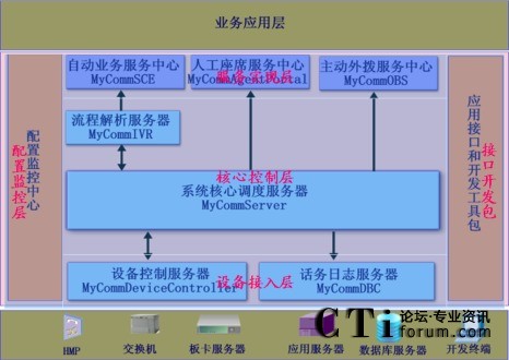 系統(tǒng)平臺(tái)層:MyComm是一個(gè)基于硬件支撐平臺(tái)之上的CTI應(yīng)用開發(fā)中間件。對(duì)下屏蔽了復(fù)雜的硬件通控制;對(duì)上,簡化和提高業(yè)務(wù)應(yīng)用的實(shí)際、開發(fā)和應(yīng)用