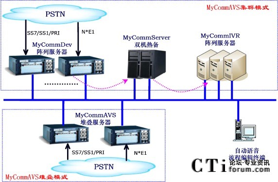MyCOmmAVS集群模式:將三大核心模塊分布部署,其中MyCommServer核心模塊為雙機熱備,而MyCommDEV和MyCommIVR都設(shè)計為集群陣列方案。其優(yōu)勢的集中監(jiān)控和管理,DEV服務(wù)器和IVR服務(wù)器任何一個節(jié)點的故障都不影響其他系統(tǒng)。