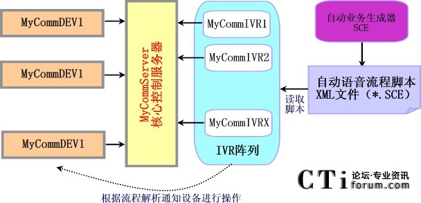 MyCommServer:核心控制服務(wù)器。實現(xiàn)對呼叫的控制,和管理DEV設(shè)備控制器和IVR流程解析器等周邊設(shè)備。