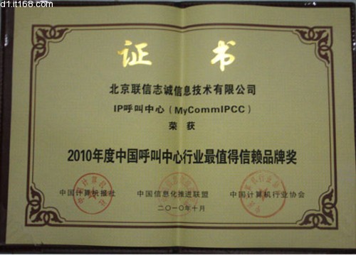 在本次評選中,北京聯(lián)信志誠信息技術(shù)有限公司(簡稱MyComm公司),其核心產(chǎn)品MyCommIPCC獨享 2010年度中國呼叫中心行業(yè)最值得信賴品牌獎。