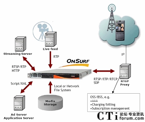 流媒體服務器(OnSurf) 使用RSTP等實時傳輸協(xié)議與客戶端進行媒體服務協(xié)商,向用戶發(fā)送媒體流,服務器同時包含語音和視頻轉(zhuǎn)碼器,用于各種音視頻媒體格式的轉(zhuǎn)換。