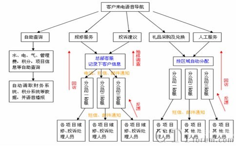 如上圖所示,客戶通過手機(jī)、電話、傳真機(jī)、IP話機(jī)等撥入XX物業(yè)全國統(tǒng)一服務(wù)熱線后,可根據(jù)系統(tǒng)語音導(dǎo)航選擇自助查詢、報(bào)修服務(wù)、投訴建議、禮品采購及兌換、人工服務(wù)等業(yè)務(wù)?蛻魣(bào)修或投訴統(tǒng)一由總部受理,再轉(zhuǎn)給各分公司所屬項(xiàng)目處理;客戶選擇采購及人工服務(wù),系統(tǒng)將根據(jù)客戶來電歸屬地將其就近接入當(dāng)?shù)匚飿I(yè)公司客服座席處理,如電話長時(shí)間未被接聽,則系統(tǒng)會(huì)自動(dòng)把電話再轉(zhuǎn)到總部受理?偛繉⒍〞r(shí)采集各分部座席錄音、通話記錄等相關(guān)管理數(shù)據(jù)。