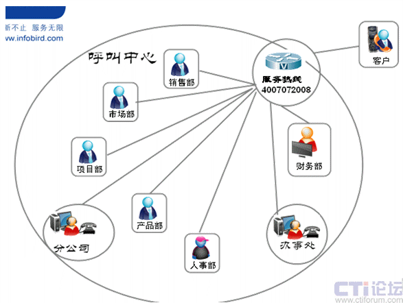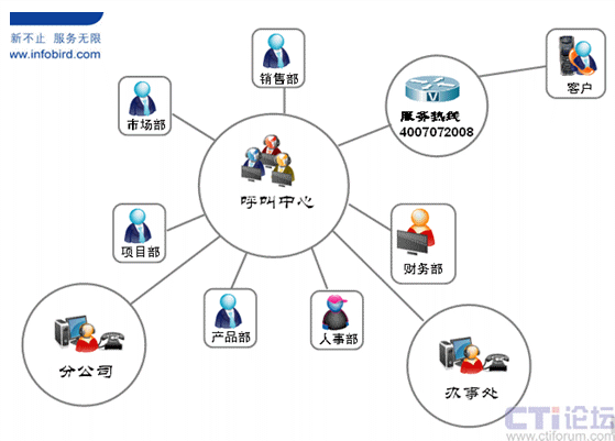 訊鳥軟件現(xiàn)有員工150人,總部位于北京,在上海設有一個分公司,在廣州、深圳分別設有一個辦事處。通過將呼叫中心與企業(yè)運營管理的融合,大大提高了員工的工作效率,降低了運營管理成本。訊鳥軟件副總裁姜冬良先生告訴我們,自2007年6月在企業(yè)運營管理中加入呼叫中心之后,所有員工對外聯(lián)系的名片上只有公司的400號碼和員工分機,不再顯示員工的手機,這樣有效的避免了因為員工流失造成的客戶服務無法及時響應的現(xiàn)象,同時,所有員工的工作狀態(tài)可以通過報表系統(tǒng)有效的衡量,尤其是銷售人員和分公司、辦事處人員的工作,管理層可以及時的檢查、監(jiān)督和糾正。