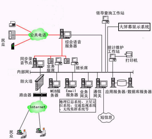本系統(tǒng)物理結(jié)構(gòu)由語(yǔ)音交換機(jī)、座席分流器、呼叫管理服務(wù)器(CTI服務(wù)器)、IVR(交互式語(yǔ)音應(yīng)答)/IFR(交互式傳真應(yīng)答、業(yè)務(wù)代表座席、調(diào)度席、統(tǒng)計(jì)維護(hù)管理工作站、數(shù)據(jù)庫(kù)/應(yīng)用服務(wù)器、通信網(wǎng)關(guān)服務(wù)器、業(yè)務(wù)網(wǎng)關(guān)服務(wù)器、錄音工作站、領(lǐng)導(dǎo)查詢工作站、大屏幕顯示系統(tǒng)、網(wǎng)絡(luò)系統(tǒng)等構(gòu)成。