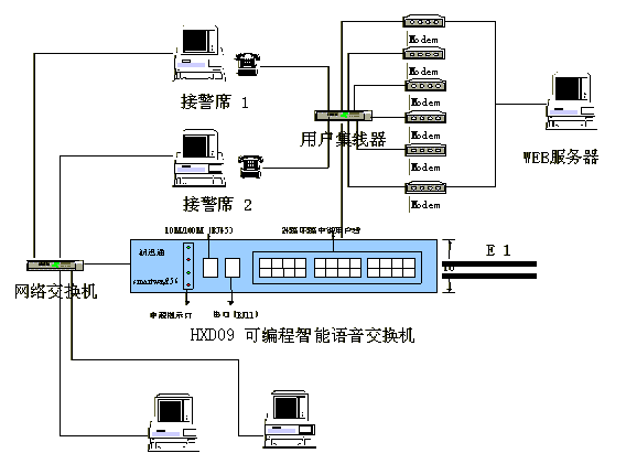 綜合接警平臺主要由hxd09可編程智能語音交換機和計算機網(wǎng)絡兩部分組成,交換機負責110、119、122報警電話的接入與分流及調度呼出等功能;計算機網(wǎng)絡則完成110、119、122報警信息的顯示、數(shù)據(jù)儲存、統(tǒng)計及信息查詢、發(fā)布功能。