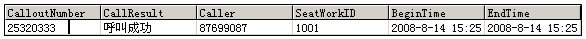 當座席E1呼入時, 接收主叫號碼(87699078), 同時發(fā)出呼叫(主叫號碼為87699078,被叫為25320333),并通過預測撥號識別各類呼叫結(jié)果,如:忙音、空號、或無人接聽等,只將有效的通話轉(zhuǎn)接至業(yè)務人員,同時將呼叫結(jié)果寫入數(shù)據(jù)庫UT_IMCALL表(如下圖),