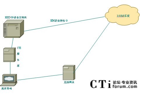 HXD09交換機(jī)通過EM接口與350M的語音線連接,當(dāng)需要呼叫某一無線終端時,由座席端發(fā)起呼叫請求到無線網(wǎng)關(guān),當(dāng)獲取到無線網(wǎng)關(guān)返回的語音通道后,HXD09交換機(jī)將和350M系統(tǒng)對應(yīng)的語音通道連接起來,實(shí)現(xiàn)有線座席和無線終端之間的通話,并可對通話進(jìn)行錄音;座席也可插入到無線終端或者某一集群之間,實(shí)現(xiàn)監(jiān)聽或者插話,這一過程同樣可以全程錄音。