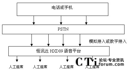 配置恒訊達(dá)公司HXD09的PRI或是7號信令接入,系統(tǒng)可自動(dòng)與交換機(jī)通信獲取主叫號碼,話務(wù)員數(shù)量根據(jù)需要配置。