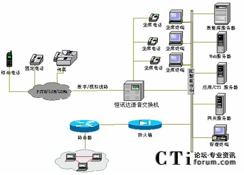 系統(tǒng)采用的硬件根據(jù)實(shí)際需求配置,如果實(shí)際接入電話容量小于30條線,系統(tǒng)與市話要采用普通模擬中繼線接入, 可選擇配置恒訊達(dá)公司HXD09的模擬板(AT0),申請的普通模擬中繼線需開通來電顯示業(yè)務(wù),如電信部門不開通項(xiàng)服務(wù),采用此種接入方式無法實(shí)現(xiàn)來電顯示功能;根據(jù)接入容量和話務(wù)員數(shù)量的總和計(jì)算卡的應(yīng)用數(shù)量,如實(shí)際接入電話容量大于等于30條線,則可采用E1接口數(shù)字中繼線接入,