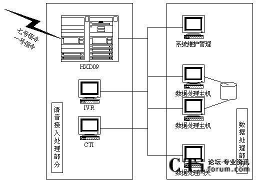 語(yǔ)音接入處理部分主要完成用戶的語(yǔ)音話路接入功能。其中:HXD09語(yǔ)音交換機(jī)可以支持七號(hào)信令和一號(hào)信令的數(shù)字E1線路的接入。HXD09的IVR完成自動(dòng)業(yè)務(wù)受理功能,實(shí)現(xiàn)系統(tǒng)7*24小時(shí)不間斷服務(wù)。CTI完成對(duì)排隊(duì)機(jī)的監(jiān)視、控制任務(wù),并能夠?qū)崟r(shí)的提供每個(gè)語(yǔ)音通道的信息配合IVR完成自動(dòng)繳費(fèi)業(yè)務(wù)的實(shí)現(xiàn)。