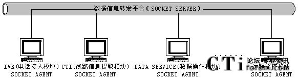 系統(tǒng)擁有的眾多的功能模塊程序都被設(shè)計(jì)成為一個(gè)個(gè)相對(duì)獨(dú)立的程序。每個(gè)程序都作為一個(gè)SOCKET AGENT登錄到系統(tǒng)擁有的數(shù)據(jù)信息轉(zhuǎn)發(fā)平臺(tái)(它實(shí)際上是一個(gè)SOCKET