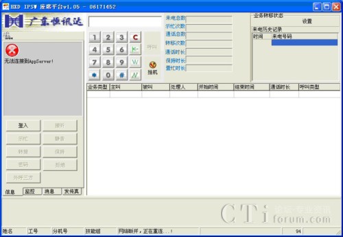 - 登陸、登出:在電召業(yè)務(wù)系統(tǒng)中為每個(gè)坐席員分配用戶(hù)名和密碼,坐席員輸入用戶(hù)名、密碼和分機(jī)號(hào)登錄軟坐席系統(tǒng)。