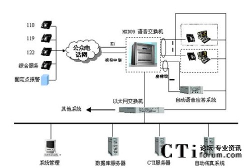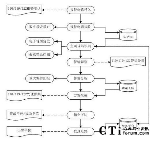 該系統(tǒng)主要分為電信子系統(tǒng)(完成聯(lián)動中心與各電信公司之間話音的傳輸、交換和分配,以及主叫號碼和主叫地址的自動查詢和傳輸?shù)龋、接警中心子系統(tǒng)(統(tǒng)一接聽和處理市民的報警、求助電話)、指揮調(diào)度子系統(tǒng)(或稱為處警中心,通過直觀的地理信息系統(tǒng)和數(shù)據(jù)庫,可以對所有的資源和警力分布了如指掌。通過一體化的無線數(shù)據(jù)傳輸和無線調(diào)度臺進(jìn)行方便的統(tǒng)一管理,指揮和調(diào)度)、信息網(wǎng)絡(luò)子系統(tǒng)(聯(lián)動中心的骨干網(wǎng)絡(luò),把各種數(shù)據(jù)數(shù)庫、接處警席位、移動的警用車載計算機(jī)等互聯(lián)在一起,形成一個強(qiáng)大的信息網(wǎng)絡(luò))、無線指揮調(diào)度通信子系統(tǒng)、大屏幕顯示子系統(tǒng)、地理信息子系統(tǒng)、GPS/GIS子系統(tǒng)。