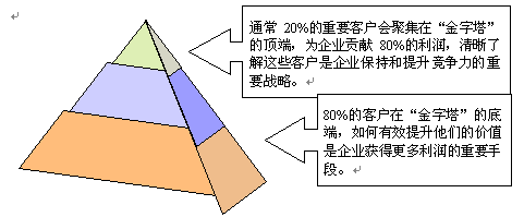 。。從抽象和通用的意義上講,多數企業(yè)的客戶價值分布是適合"二八法則"的,即20%的客戶創(chuàng)造了80%的利潤。但對每個企業(yè)而言,要洞察"究竟哪些客戶才是最有價值的客戶?""這些客戶在哪些方面的價值最大?""他們有什么共同的特征?"卻不是一件很容易的事。目前,多數企業(yè)的管理方式還停留在根據某一項或兩項單一指標(如銷售額或利潤)來作的客戶排行,無法進行多方位的綜合的客戶價值分析、管理。而要實現(xiàn)"以客戶為中心"的CRM理念,就必須建立一套全面的客戶價值評估管理系統(tǒng),并利用系統(tǒng)強大的數據分析、挖掘功能,快速地進行客戶群價值細分管理,建立起客戶價值金字塔。