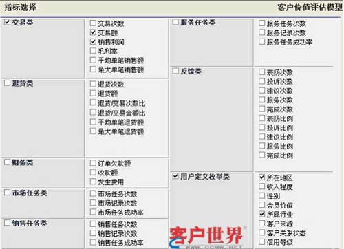 TurboCRM在長期支持CRM應(yīng)用實踐過程中,總結(jié)出一套完整實用的客戶價值評估模型,評估指標包括交易類、財務(wù)類、服務(wù)類、反饋類、枚舉類、自定義指標等(如圖),結(jié)合不同的指標可以幫助企業(yè)評估客戶價值。