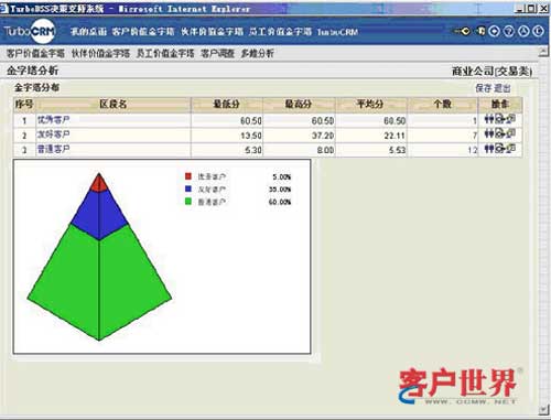 根據(jù)預(yù)先設(shè)定的客戶價值評估模型,CRM會自動計算出每個客戶的價值得分以及對應(yīng)到不同等級的客戶價值,并會記錄到客戶項下,便于業(yè)務(wù)人員在與客戶接觸時,直觀了解客戶價值情況?蛻魞r值金字塔分析(如圖),可以動態(tài)的了解各類客戶的價值分布。