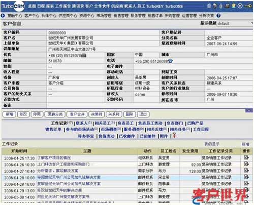 信息整合是CRM系統(tǒng)實現(xiàn)對客戶信息進行管理的基礎(chǔ),將客戶的各類信息進行關(guān)聯(lián),當查詢某個客戶時,與該客戶相關(guān)的歷史接觸記錄、交易記錄都可一目了然地展現(xiàn)出來,也可以方便地進行相關(guān)信息的及時錄入。(如下圖)