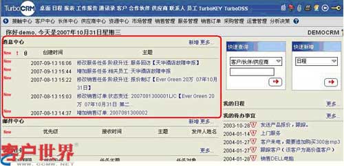 TurboCRM系統(tǒng)的消息中心是協(xié)同工作的核心,當客戶接觸過程有進展時,相關(guān)員工的桌面會出現(xiàn)消息提醒,以方便員工及時地了解客戶動態(tài)。