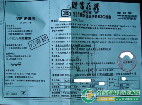 前不久,齊先生接到一個自稱中國聯(lián)通客服負(fù)責(zé)人的電話,邀他參加“3G經(jīng)濟(jì)高峰論壇”。起初他并不相信,但對方發(fā)來的“財(cái)富在握”的邀請函上,顯要位置確實(shí)打著“精彩在沃,聯(lián)通與您共享3G盛宴”的字樣,并且支持單位也是“中國聯(lián)合通信網(wǎng)絡(luò)有限公司佛山市禪城分公司”(詳見下圖)。一想到中國聯(lián)通是國企,也是大公司,值得依賴,再加上自己是聯(lián)通公司十幾年的老用戶,所以未加多想就答應(yīng)參加了。