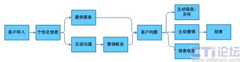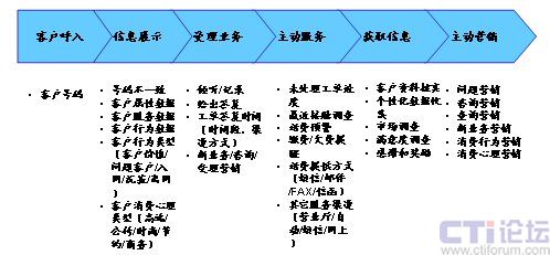 在上面的流程中,將一次客戶接觸,轉變?yōu)橐淮稳娴目蛻艋訖C會,通過對客戶信息360度的洞察和客戶的互動溝通,在為客戶提供基本服務的同時,根據(jù)客戶的基本資料、歷史消費數(shù)據(jù)等,挖掘客戶的隱性需求,從而有選擇的開展客戶關懷、客戶信息收集、客戶維系、主動營銷活動。下面以一個電信運營商的客戶呼入流程為例,說明在一個以客戶為中心的客戶接觸流程中,坐席代表可以開展的客戶接觸活動(圖4)。