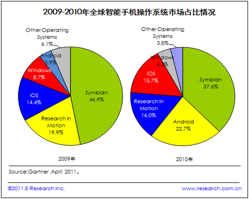 根據(jù)Gartner最新發(fā)布的數(shù)據(jù)可以看到,智能手機(jī)操作系統(tǒng)市場占比情況從2009年到2010年變化很大,Symbian仍然是占比最大的操作系統(tǒng),但是,其下降趨勢可見一斑。而Android和iOS則快速增長,2010年Android以22.7%的市場份額位列第二。經(jīng)過2011年的發(fā)展,這一市場格局還將有新的變化。