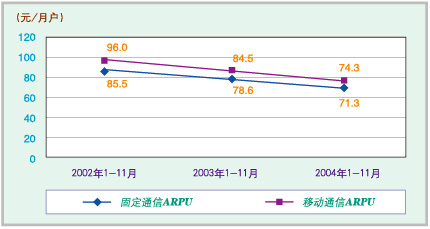 圖二:2002~2004年同期固網(wǎng)通信與移動通信ARPR比較(中國信息產(chǎn)業(yè)部)