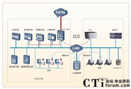 客戶電話通過PSTN統(tǒng)一由華為UAP3300排隊(duì)機(jī)接入,由華為平臺(tái)的IVR服務(wù)器進(jìn)行業(yè)務(wù)導(dǎo)航分流,根據(jù)用戶的選擇和IVR流程的配置進(jìn)行路由,可以選擇不同平臺(tái)來處理此業(yè)務(wù)。來話根據(jù)IVR流程路由后,兩個(gè)平臺(tái)采用負(fù)荷分擔(dān)方式進(jìn)行工作。在將來話導(dǎo)入兩個(gè)平臺(tái)后,采用不同設(shè)備的IVR進(jìn)行業(yè)務(wù)分配,不同平臺(tái)的座席處理不同的業(yè)務(wù)。在處理過程中,不同平臺(tái)的座席之間可以互轉(zhuǎn),達(dá)到全網(wǎng)資源共享的功能。