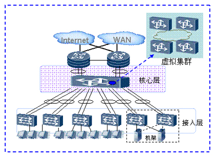 如上圖所示,整個(gè)數(shù)據(jù)中心網(wǎng)絡(luò)通過虛擬集群技術(shù),多個(gè)核心層設(shè)備虛擬為一臺(tái)設(shè)備。通過增加核心節(jié)點(diǎn),提供無(wú)阻塞的網(wǎng)絡(luò)能力,接入更多服務(wù)器。服務(wù)器的規(guī)?梢詮3000臺(tái)“無(wú)級(jí)擴(kuò)展”到數(shù)萬(wàn)臺(tái)。在滿足企業(yè)日益增長(zhǎng)的業(yè)務(wù)需求的同時(shí),并不增加網(wǎng)絡(luò)的復(fù)雜度,減少管理和維護(hù)的成本。