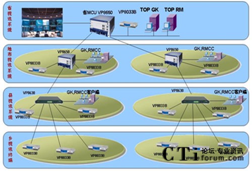 這是目前國(guó)內(nèi)最大的政府應(yīng)急視頻會(huì)議指揮系統(tǒng),現(xiàn)網(wǎng)可以借鑒的經(jīng)驗(yàn)很少,華為公司充分意識(shí)到該項(xiàng)目的重大意義,投入大量人力物力進(jìn)行網(wǎng)絡(luò)環(huán)境調(diào)研和客戶需求分析,經(jīng)過(guò)眾多專家和工程人員的反復(fù)論證,最終該套系統(tǒng)采取了分布式三級(jí)級(jí)聯(lián)組網(wǎng)結(jié)構(gòu)和四級(jí)分級(jí)分權(quán)管理模式,具有強(qiáng)大的備份能力和豐富的功能特性,在省和9個(gè)地市分別配置1臺(tái)8650MCU和1套管理軟件,在58個(gè)縣分別配置1臺(tái)8630 MCU,在1205個(gè)會(huì)議室分別配置1臺(tái)8033B終端。