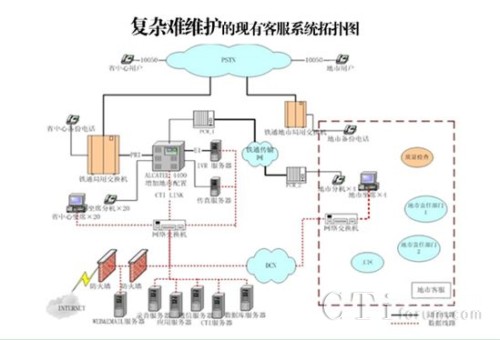 中國鐵通10050客戶服務(wù)中心,自2002年全國各省建設(shè)完畢后,一直為鐵通的用戶提供各種業(yè)務(wù)咨詢、故障處理及投訴申告服務(wù)。隨著鐵通用戶數(shù)量的不斷激增,鐵通目前的10050客服中心系統(tǒng)從技術(shù)架構(gòu)、規(guī)模、功能上均無法滿足市場服務(wù)需求,所用的各種核心設(shè)備也基本停產(chǎn),造成了很大的維護(hù)難題。