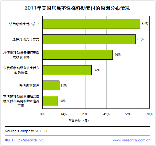 iResearch 艾瑞咨詢整理Compete 的最新數(shù)據(jù)研究發(fā)現(xiàn),在未選擇移動支付的美國居民中,有64%的受訪者認(rèn)為移動支付不安全,這成為美國居民選擇移動支付的最大障礙。另有61%的受訪者表示目前仍希望使用其他支付方式,此外還有46%的居民只使用移動設(shè)備接打電話或收發(fā)郵件。