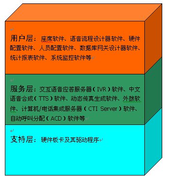 2、服務(wù)層:交互語音應(yīng)答服務(wù)器(IVR)軟件、中文語音合成(TTS)軟件、動(dòng)態(tài)傳真生成軟件、外撥軟件、計(jì)算機(jī)/電話集成服務(wù)器(CTI Server)軟件、自動(dòng)呼叫分配(ACD)軟件等等。
