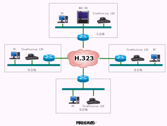 結(jié)合遼寧省消防網(wǎng)絡(luò),本方案設(shè)計(jì)的視頻會(huì)議系統(tǒng)承載在遼寧省消防局的IP網(wǎng)絡(luò)平臺(tái)上,采用國(guó)際流行的ITU H.323通信標(biāo)準(zhǔn)。系統(tǒng)采用以MCU為中心輻射各個(gè)會(huì)場(chǎng)電視會(huì)議終端的星型網(wǎng)絡(luò)結(jié)構(gòu)。整套系統(tǒng)由16個(gè)會(huì)場(chǎng)組成,采用美國(guó)Polycom公司的ViewStation 128會(huì)議室型終端設(shè)備。網(wǎng)管中心安放一臺(tái)Polycom 公司的MGC-50(多點(diǎn)會(huì)議控制單元),用于對(duì)全網(wǎng)終端的控制,實(shí)現(xiàn)多點(diǎn)、點(diǎn)對(duì)點(diǎn)的會(huì)議。