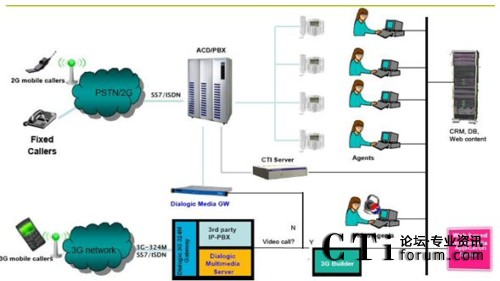 Bridge與web server連接,3G Bridge起的主要作用就是把web上的http轉(zhuǎn)換成RTP\RTSP文件,這樣就完成了web與3G手機(jī)的互動(dòng),同樣的,如果您想和傳統(tǒng)的呼叫中心互聯(lián)互通,只需要用Dialogic的媒體服務(wù)器做連接,就可以把3G與2G