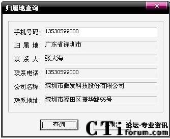 在A8電腦傳真機(jī)的電話商務(wù)通主界面,點(diǎn)擊歸屬地按鈕,出現(xiàn)手機(jī)歸屬地查詢界面,輸入手機(jī)號(hào)碼,點(diǎn)擊查詢,界面上會(huì)顯示出該手機(jī)的歸屬地,如果此號(hào)碼已在電話簿中,則界面上會(huì)同時(shí)顯示該電話對應(yīng)的聯(lián)系人信息。