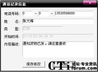 在A8電腦傳真機(jī)的電話商務(wù)通軟件主界面,雙擊通話記錄中的某個(gè)客戶號(hào)碼,或選中該號(hào)碼點(diǎn)擊下面的通話歷史按鈕,您與該客戶的通話歷史便一覽無余。選中某個(gè)記錄,您可以對其進(jìn)行編輯(添加姓名、備注該次通話的內(nèi)容),刪除,軟件撥出,加入電話簿等操作。