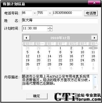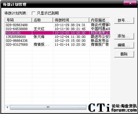 A8電腦傳真機(jī)的通話記錄和通話歷史讓您記住過去,來電彈屏和自動(dòng)答錄助您處理現(xiàn)在,待撥計(jì)劃和到時(shí)提醒則幫您安排未來。點(diǎn)擊電話商務(wù)通主界面中的待撥計(jì)劃按鈕,出現(xiàn)您未來將要撥出電話的日程安排,您可以對其進(jìn)行添加、編輯和刪除等操作。時(shí)間一到A8電腦傳真機(jī)會(huì)自動(dòng)彈屏提醒,待撥計(jì)劃中的電話一經(jīng)撥出,A8會(huì)自動(dòng)刪除該電話號(hào)碼。
