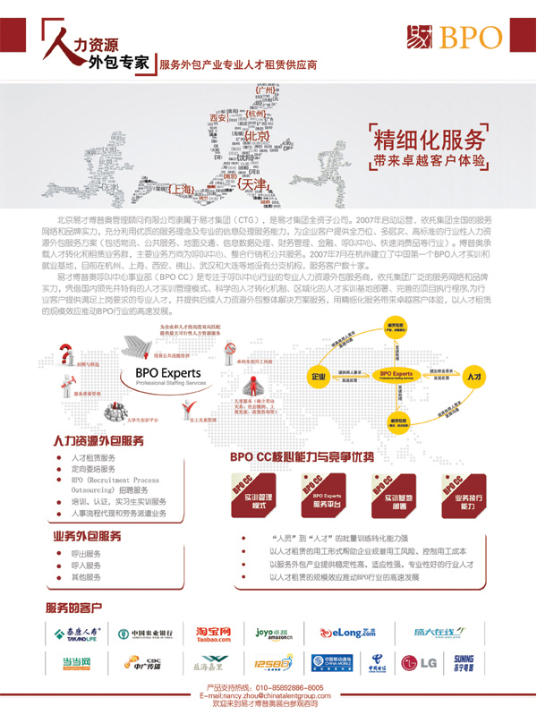 北京易才博普奧管理顧問(wèn)有限公司(CTG BPO)是易才集團(tuán)全資子公司。2007年啟動(dòng)運(yùn)營(yíng),依托集團(tuán)全國(guó)的服務(wù)網(wǎng)絡(luò)和品牌實(shí)力,充分利用優(yōu)質(zhì)的服務(wù)理念及專業(yè)的信息處理服務(wù)能力,為企業(yè)客戶提供全方位、多層次、高標(biāo)準(zhǔn)的行業(yè)性人力資源外包服務(wù)方案(包括物流、公共服務(wù)、地面交通、信息數(shù)據(jù)處理、財(cái)務(wù)管理、金融、呼叫中心、快速消費(fèi)品等行業(yè))。