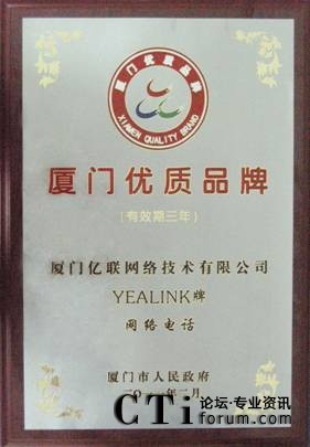 CTI論壇(ctiforum)3月4日消息(記者 潘婷婷): 2011年3月3日,中國(guó)最佳IP話機(jī)提供商,暢銷歐美IP通信終端市場(chǎng)—億聯(lián)公司(Yealink)旗下全系列產(chǎn)品近日被廈門市政府授予2010年“廈門市優(yōu)質(zhì)品牌”稱號(hào),為Yealink品牌建設(shè)添上了重要的一筆。