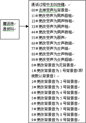 變聲通話功能也叫魔話功能,是指用戶(hù)通過(guò)通過(guò)播打特殊的號(hào)碼接入到本平臺(tái)后,再通過(guò)本平臺(tái)去呼叫最終的被叫用戶(hù),在這樣的一個(gè)通話過(guò)程中,可以通過(guò)本平臺(tái)提供8級(jí)變聲和原聲功能:“男聲超粗、男聲特粗、男聲粗、男聲微粗、原聲、女聲微細(xì)、女聲細(xì)、女聲特細(xì)、女聲超細(xì)”。在通話過(guò)程中實(shí)時(shí)變聲,并可按鍵選擇改變變聲系數(shù)或恢復(fù)原聲,趣味非凡,超常體驗(yàn)。