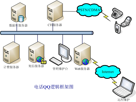 電話QQ系統(tǒng)主要由CTI服務(wù)器、數(shù)據(jù)庫服務(wù)器、計費服務(wù)器、短信服務(wù)器、管理維護臺和Web服務(wù)器組成。