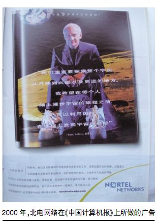 2000年,北電網(wǎng)絡(luò)在《中國計(jì)算機(jī)報(bào)》上所做的廣告  1995年,北電開始從電話制造公司向網(wǎng)絡(luò)設(shè)計(jì)、構(gòu)建及集成公司的演變。起初,業(yè)界分析人士對(duì)此予以奚落,認(rèn)為這是一家電信商膚淺的裝飾門面之舉。一位分析師曾尖銳地稱之為“一群四十多歲的人穿著跳迪斯科的衣服”。