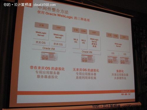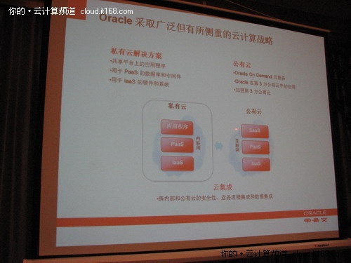 而甲骨文是關(guān)注公有云還是私有云呢?就如甲骨文“更多的企業(yè)最終將混合采用公有云和私有云”那樣,甲骨文的云計(jì)算策略是既支持公有云又支持私有云使客戶有選擇余地。不過喻思成也坦言,由于甲骨文關(guān)注企業(yè)市場,可能更多的精力還是放在私有云的建設(shè)上。