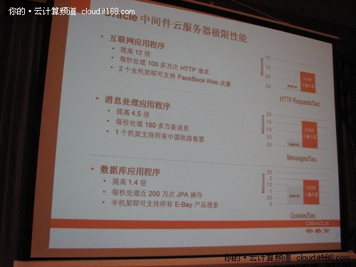 在溝通會上,喻思成用數(shù)字來告訴媒體Oracle中間件云服務(wù)器的Java應(yīng)用性能和可靠性在甲骨文進(jìn)行的內(nèi)部測試中,單機(jī)架Oracle Exalogic Elastic Cloud顯示: 互聯(lián)網(wǎng)應(yīng)用性能提高12倍,達(dá)到每秒100萬HTTP以上;消息處理應(yīng)用性能提高4.5倍,每秒能處理超過180萬條消息。