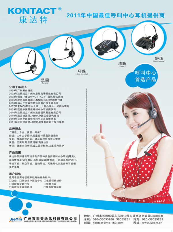 康達特通訊耳機產(chǎn)品主要應用于企業(yè)和政府的客戶服務中心、電話營銷中心、商務中心、緊急指揮中心、酒店總機等辦公場所,對于長期從事電話營銷、電話咨詢、商務調(diào)查等工作人員,是一件必不可少的通訊工具。