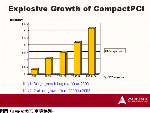 Magazine 估計(jì),CompactPCI市場(chǎng)將由1999年的美金$350 Million成長(zhǎng)到2003年的美金$3200 Million,年復(fù)合成長(zhǎng)率高達(dá)45.6%,其中又以2002年至2003年最大幅成長(zhǎng)。CompactPCI為工業(yè)計(jì)算機(jī)產(chǎn)業(yè)開拓了一個(gè)以往傳統(tǒng)工業(yè)計(jì)算機(jī)無(wú)法應(yīng)用的新市場(chǎng),而CompactPCI需針對(duì)電信等級(jí)應(yīng)用提供高可靠度及達(dá)到嚴(yán)苛高品質(zhì)要求,卻又為傳統(tǒng)工業(yè)計(jì)算機(jī)廠商豎立高進(jìn)入障礙,因此,目前能提供電信級(jí)CompactPCI寬頻通訊平臺(tái)幾為國(guó)外廠商,如Motorola、Ziatech、Force